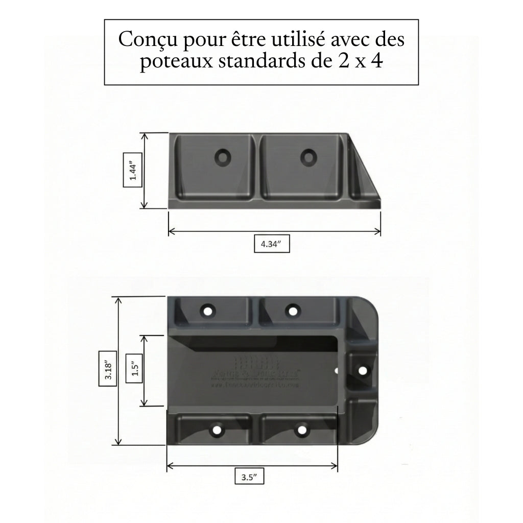 - Conçu pour s'adapter aux rampes en bois commerciales standard de 2 po x 4 po (en réalité 1 ½ po x 3 ½ po)