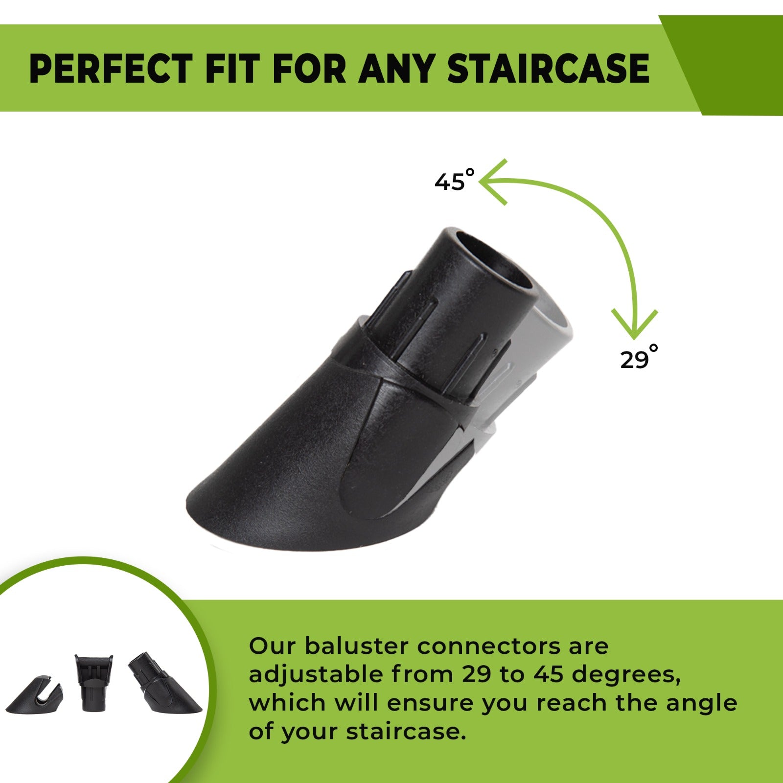 - Adjustable Connectors: Available in two package sizes—24 or 96 connectors—suitable for installing 12 or 48 round balusters (3/4" diameter). Compatible with various railing designs, offering adjustability from 29 to 45 degrees. Ideal for both DIY and contractor projects.